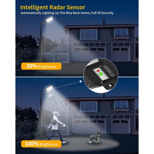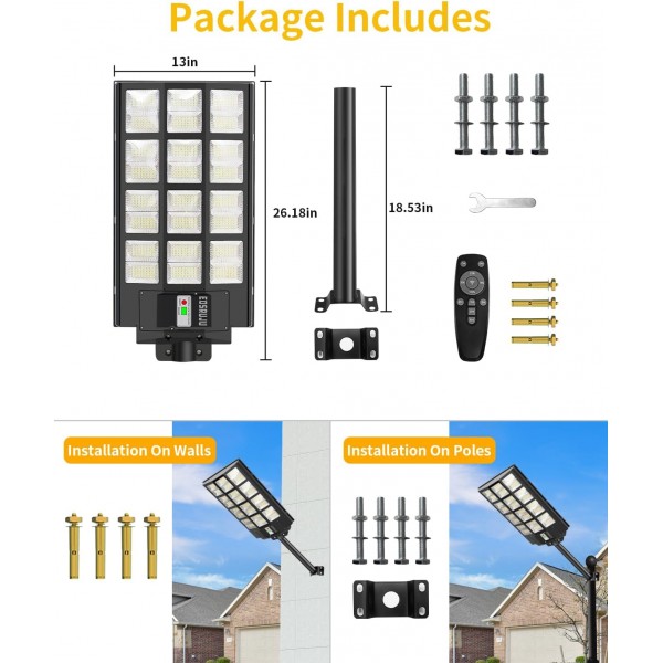 Super lumineux et grande couverture d'éclairage : Ce lampadaire solaire est équipé de 1152 perles de lampe LED SMD3750 super lumineuses, qui peuvent fournir un éclairage incroyable jusqu'à 240000 lumens. Par rapport aux lampadaires ordinaires, notre design incurvé de lampadaire solaire offre une plage d'éclairage ultra-large de 240°, couvrant jusqu'à 250 pieds carrés.
