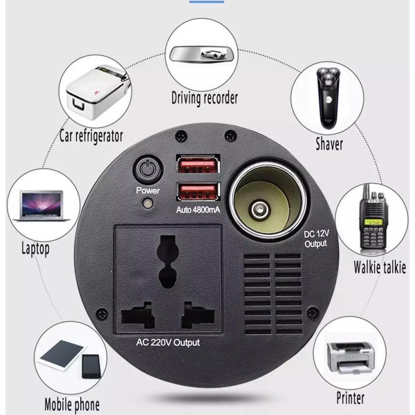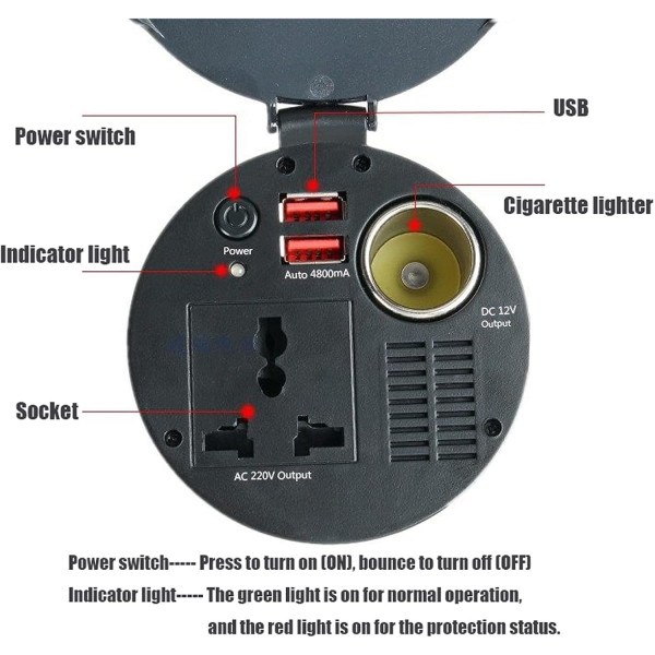 - Avantage : Fournit une alimentation continue de 150 W en courant alternatif avec 1 prise secteur et 2 ports de charge USB, une prise allume-cigare 12 V, idéale pour une utilisation dans les campings, les voyages sur la route ou partout où un onduleur de courant continu à courant alternatif est nécessaire.