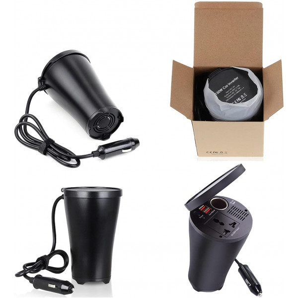Porte-gobelet Convertisseur de Tension inverseur 150W, DC 12V à AC 220V, Prise Allume-cigare 3-en-1 pour Chargeur de Voiture + Prise Secteur + convertisseur de Tension à Deux Ports de Charge USB.