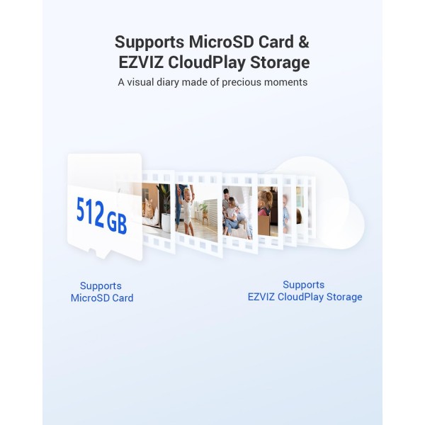 La CB2 utilise la dernière technologie de compression vidéo H.265, qui rend la vidéo plus claire et plus fluide tout en réduisant le besoin d'espace de stockage de données et de bande passante. Sécurisez vos vidéos enregistrées sur une carte microSD locale jusqu'à 256 Go (carte non incluse), ou abonnez-vous au CloudPlay d'EZVIZ pour un stockage cloud entièrement crypté et une tranquillité d'esprit supplémentaire.