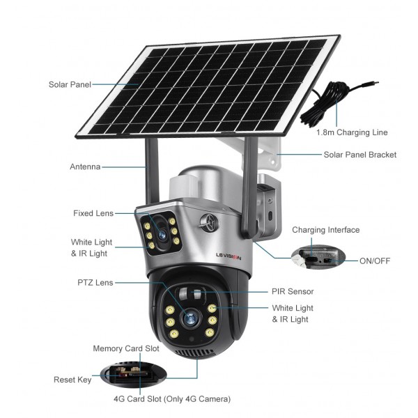 LS VISION Caméra Solaire 4G Extérieure Double Lentilles PTZ - 10MP - Night Vision Détection Alarme PIR